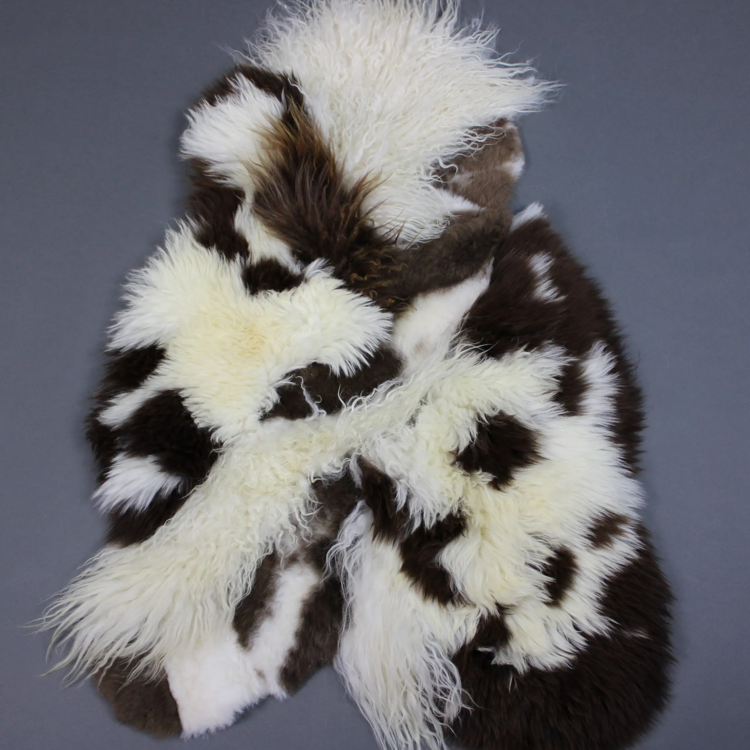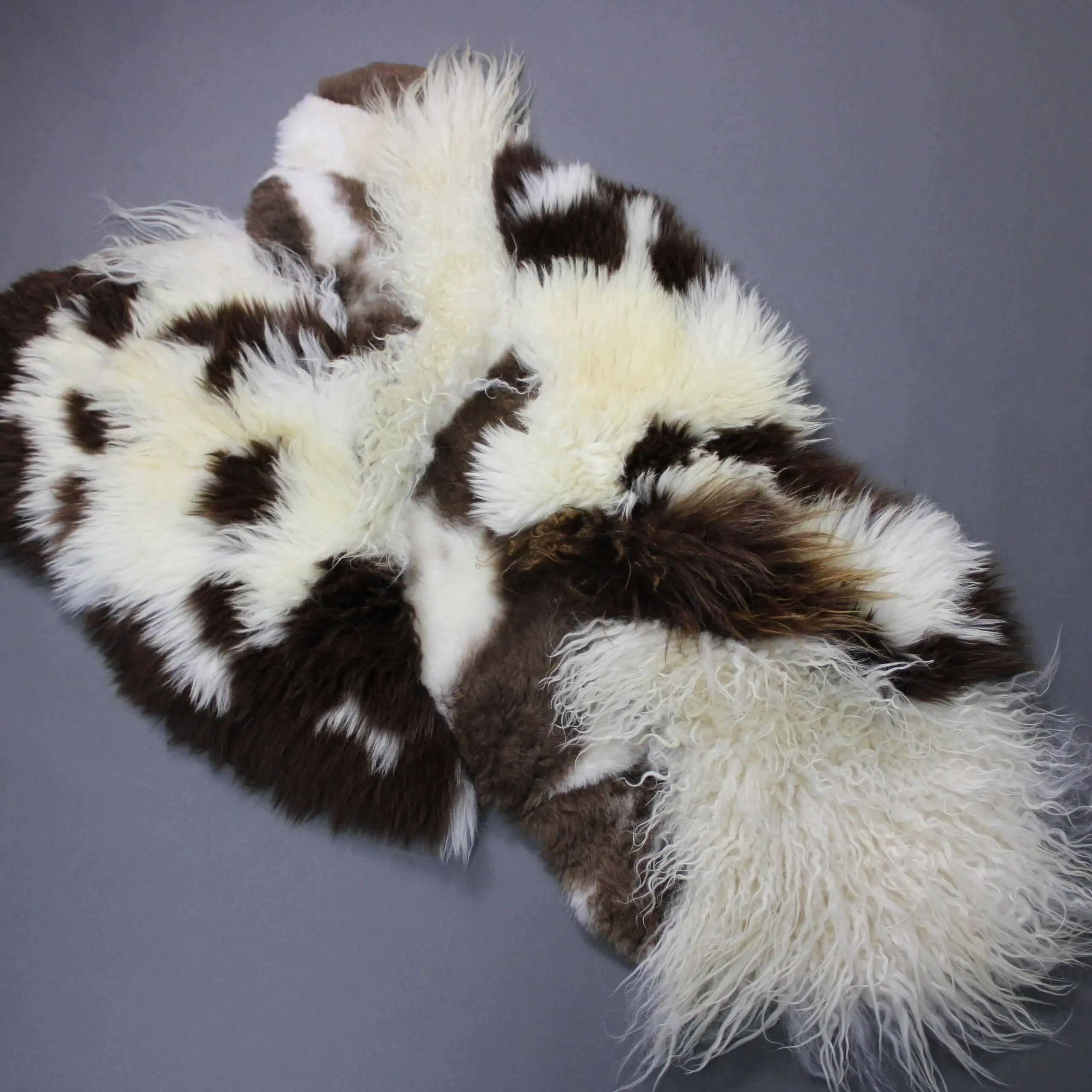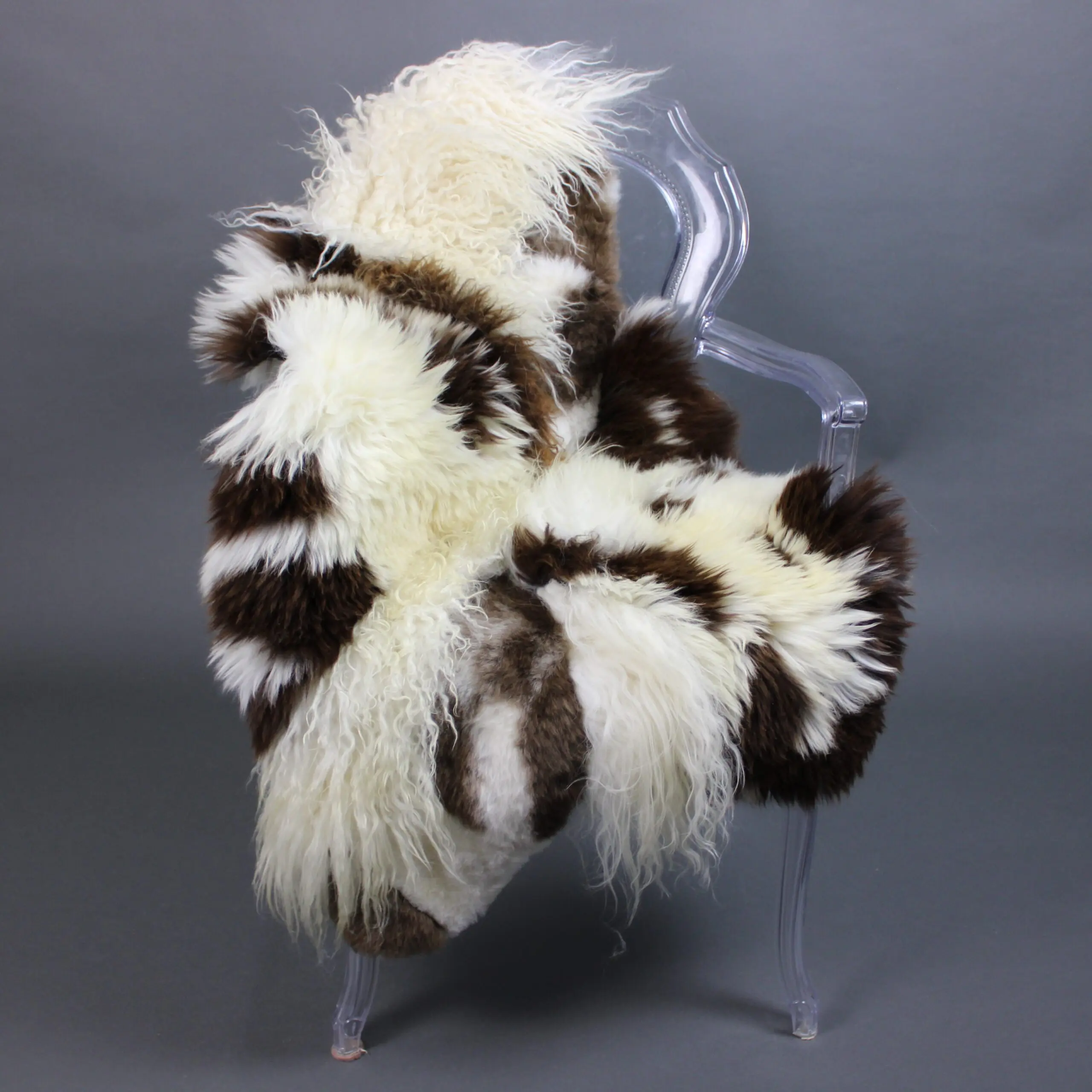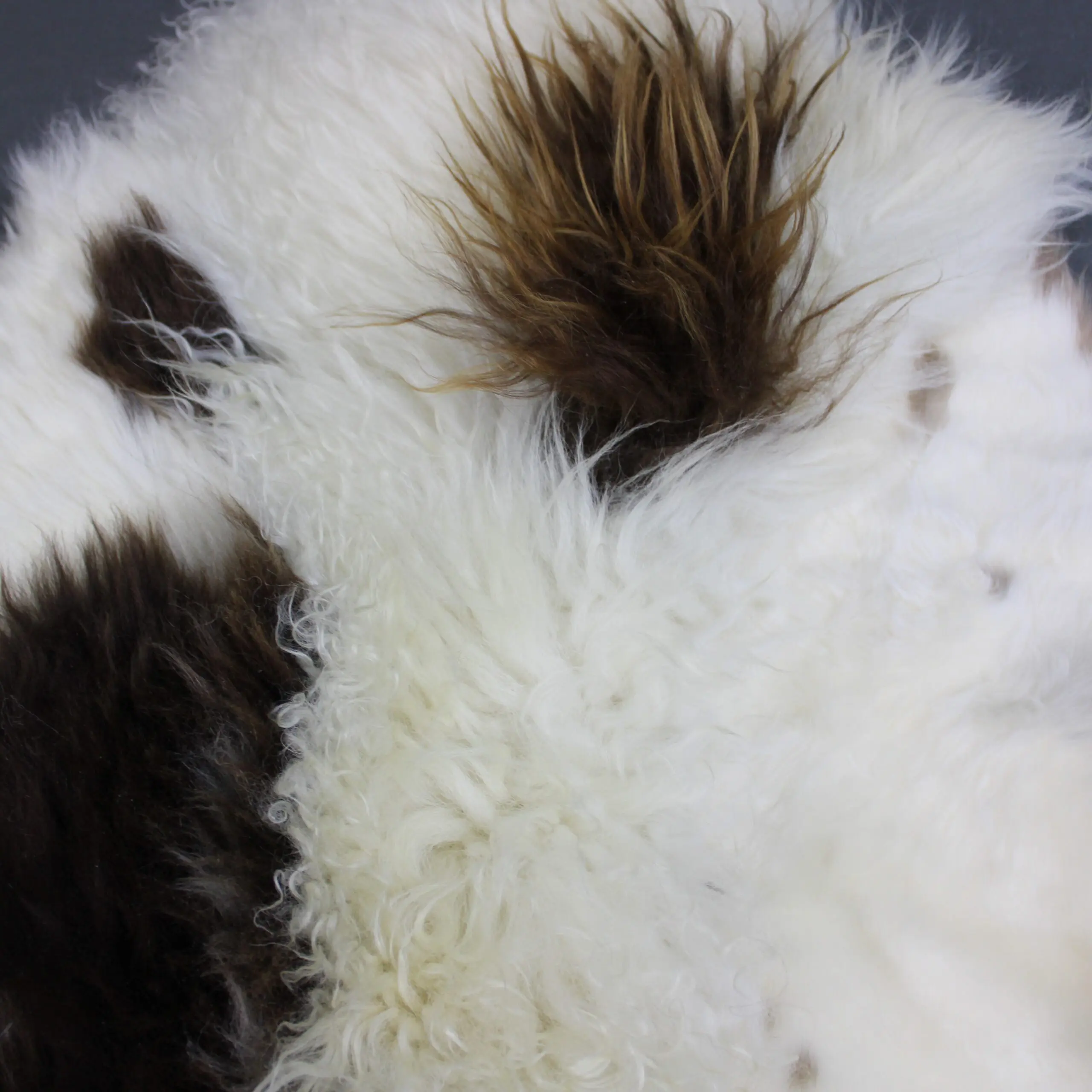 A gorgeous multi-layered sheepskin rug. The white, ivory, cream, brown and a mix of rusty’s color combination is a timeless, versatile, and natural pairing that creates a warm, sophisticated, and inviting aesthetic. A lovely combination of Icelandic long hair, Icelandic shorn (shearling) and Rare Breed fleece for something truly different. Expertly hand stitched, these rugs are beautifully unique and captivating! Measures approximately 120 x 75 cm.