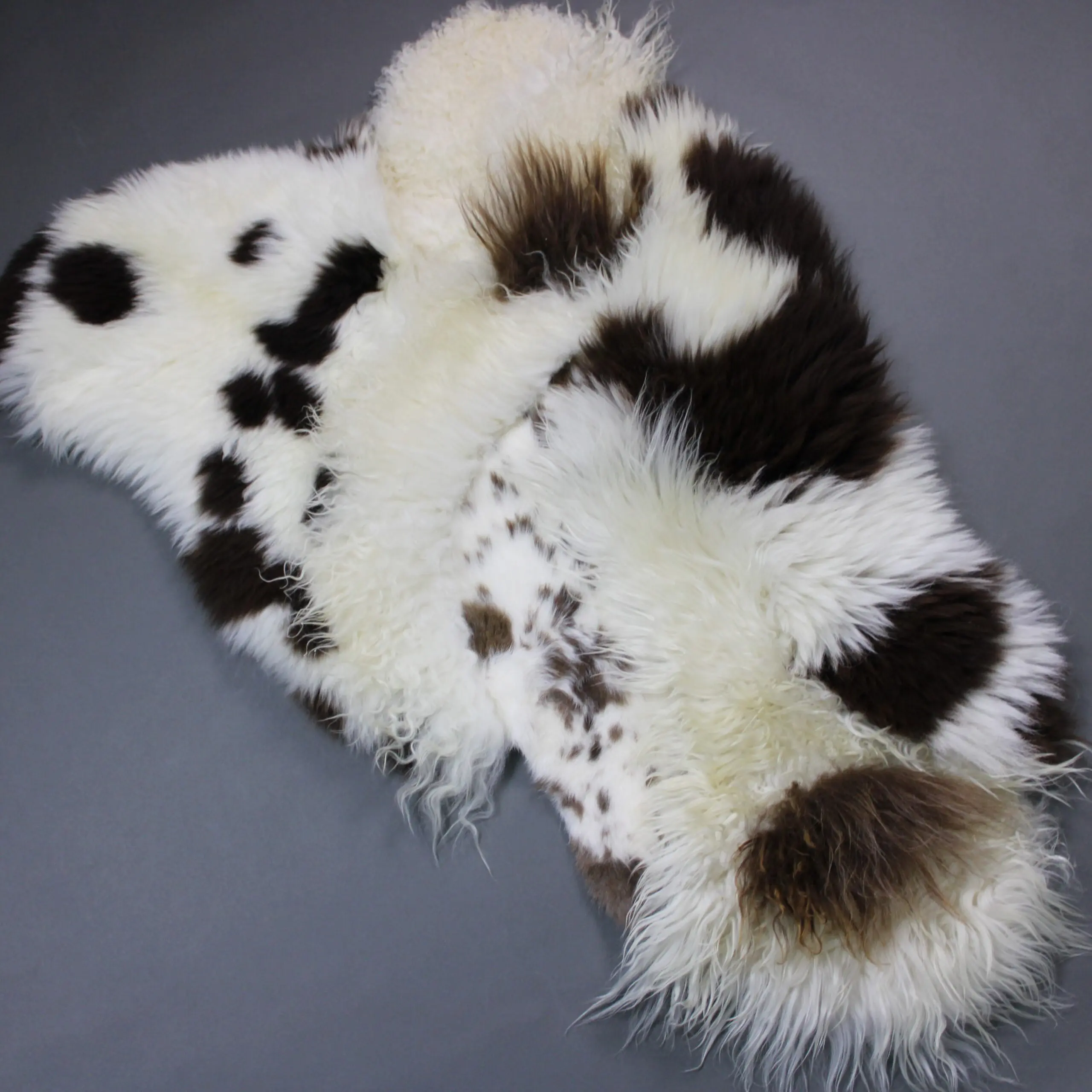 A gorgeous multi-layered sheepskin rug. The white, ivory, cream, brown and a mix of rusty’s color combination is a timeless, versatile, and natural pairing that creates a warm, sophisticated, and inviting aesthetic. A lovely combination of Icelandic long hair, Icelandic shorn (shearling) and Rare Breed fleece for something truly different. Expertly hand stitched, these rugs are beautifully unique and captivating! Measures approximately 117 x 75 cm.